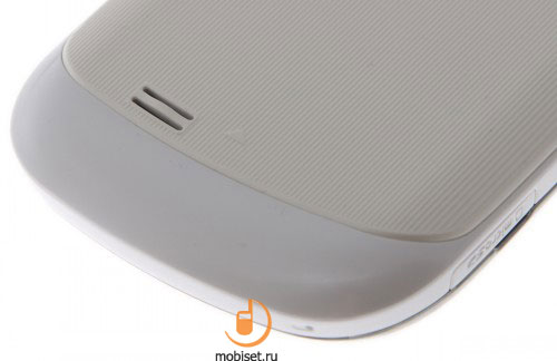 Задняя часть смартфона закрыта съемной панелью из белого матового пластика с вертикальными полосами, который проходят по всей длине крышки. Можно увидеть, что ее цвет немного отличается от оттенка каркаса устройства.