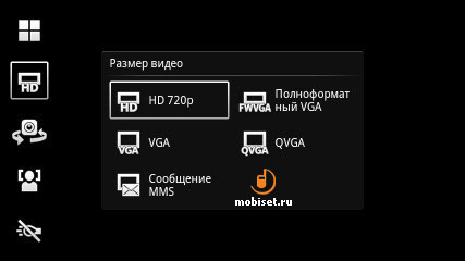 Размер видео: HD 720p, FWVGA (800x480), VGA (640x480), QVGA (320x240), мультимедийное сообщение (320х240 точек). Иные настройки аналогичны тем, что применяются при фотографировании.