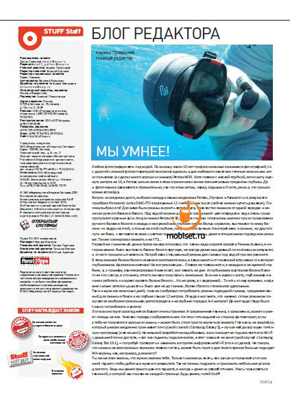 Сегодня к нам в руки попалась российская версия «стаффа». Удивительно, но рассматриваемый номер за сентябрь представляет собой, можно сказать, русифицированную копию британского августовского. Наверное, процентов восемьдесят материалов оказалось переводными, остальные двадцать – это статьи «на правах рекламы», а также посвящения таким внутрирыночным продуктам, как, к примеру, очередной телефон МТС. Это не так хорошо, поскольку потребители (а значит, и читатели) в России и Великобритании разные, с разнящимися интересами и предпочтениями. Хотелось бы, чтобы коллектив авторов отечественного «стаффа», работая под всемирно известным брендом, привносил в издание что-нибудь своё. Тем не менее давайте посмотрим, что к чему.