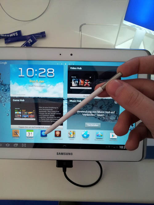 В сети появились фотографии обновленного Samsung Galaxy Note 10.1. На фото видно, что корейский производитель не только поменял процессор своего планшета на 4-ядерный, но и внес в аппарат некоторые конструктивные изменения. Так, в корпусе Samsung Galaxy Note 10.1 появился отсек для хранения S Pen. Корейцы уменьшили толщину электронной ручки, но выпустили специальный держатель, который позволит заметно увеличить ее размеры. Последнее нововведение придется по душе тем, кто привык работать с более габаритными вещами.