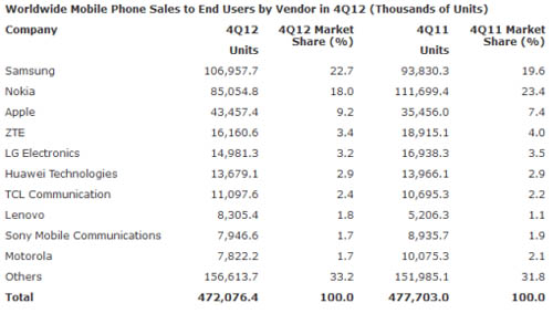 Однако лидером в этой сфере по-прежнему остается именно корейский производитель, поставивший в прошлом квартале 64,5 млн смартфонов, тогда как Apple отгрузила только 43,5 млн iPhone. Что касается третьего места рейтинга, то по итогам года его заняла китайская компания Huawei, продавшая более 27 млн смартфонов - на 73,8% больше, чем в 2011 году.