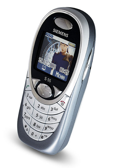 Самым неоднозначным продуктом 55-й серии следует назвать самый главный аппарат этой линейки, Siemens S55. Главный потому, что был призван продемонстрировать технологичный максимум, которым владел немецкий вендор. Неоднозначный же оттого, что этих технологий многим показалось недостаточно, иными словами, ожидали большего. Это первый аппарат Siemens с цветным экраном, с Bluetooth, MMS. Это компактный телефон в прекрасном, эталонном для бизнес-сегмента дизайне, где сочетаются элементы под металл, разноцветный пластик, причем не черного, а серого и белого цветов. Это ёмкая записная книжка, достойный органайзер. Это возможность разговаривать по bluetooth-гарнитуре, обмениваться файлами по тому же Bluetooth или ИК-порту. Это масса Java-игр. Это съемка камерой, которая приобретается отдельно в качестве дополнительного аксессуара (вещь бессмысленная, ведь если носить эту немаленькую «фотоприставку» с собой, то лучше приобрести обыкновенную «мыльницу»).