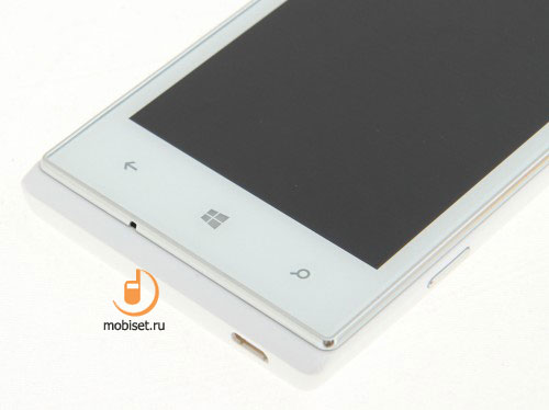 Внизу три стандартные сенсорные кнопки для WP-смартфона. Символы понятны, у них есть подсветка, но она неяркая и довольно тусклая.
