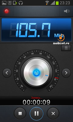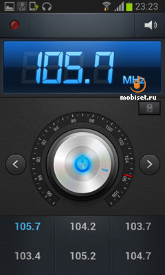 Приемник поддерживает RDS, работает в фоновом режиме, а в случае необходимости отключается через установленное время (30 минут, 1 или 2 часа). Станции находятся как в автоматическом, так и в ручном режиме. Любимые станции выносятся в нижнее поле, которое можно листать в стороны, перемещаясь между ними. Радио работает только с подключенными наушниками, можно записать передачу в телефон и сохранить её.