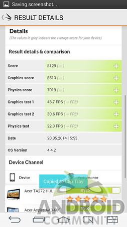 Как и следовало ожидать, новинка показала очень неплохие результаты в различных тестах. Хотя и не стала в них бесспорно лучшим гаджетом. К примеру, смартфон набрал 29156 баллов в бенчмарке AnTuTu, что позволило ему занять второе место, пропустив вперёд только планшетофон Samsung Galaxy Note 3.