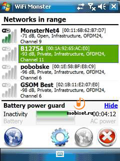 В случае если инициализация адаптера пройдет успешно, программа просканирует список доступных сетей. Для каждой из найденных сетей можно просмотреть ее параметры, в том числе диапазон используемых IP-адресов, уровень сигнала и максимальную скорость, обеспечиваемую данной сетью. Также программа позволяет контролировать текущий уровень заряда аккумулятора используемого устройства и может отключать Wi-Fi, при снижении уровня заряда ниже установленного пользователем предела.